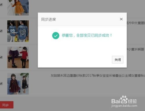 第六,在底部继续点击“同步”,就开始进行同步到手机端的宝贝了,等待直到出现“恭喜您,全部宝贝已同步成功!”就OK了,点击关闭就可以了。
