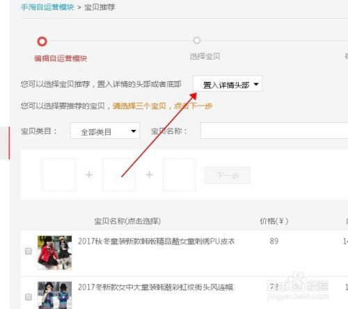 第三,在“您可以选择宝贝推荐,置入详情的头部或者底部”旁边的下拉框点击,选择要“置入详情头部”还是“置入详情底部”。