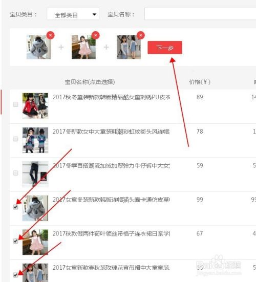 第四,在下方的宝贝中挑选三个不错的宝贝,在宝贝前的小框打勾,然后点击“下一步”。