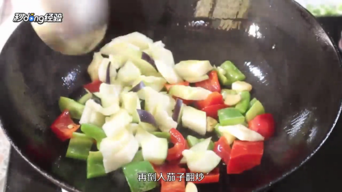 放入青椒和彩椒,翻炒,倒入茄子翻炒。