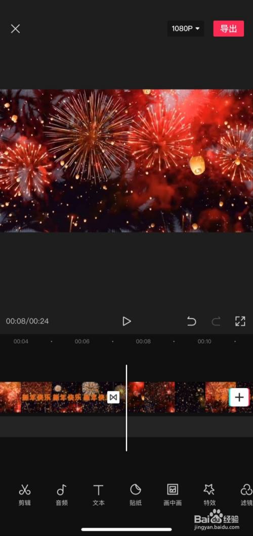 设置完成后,点击右下角对勾,就会发现白色方块中出现蝴蝶结标识,添加转场成功,点击导出,即可保存到相册。