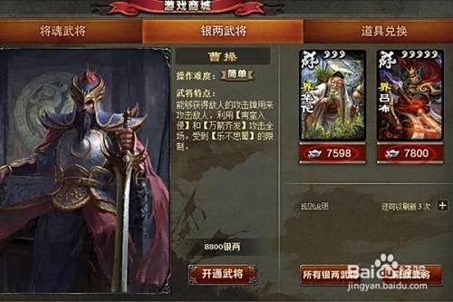 三国杀中武将的获取方式有几种,其中用银两购买是比较重要的一种方式,在游戏商城中点击银两武将,根据自己的银两存储量及对武将的钟爱程度逐渐扩大自己的武将阵营;