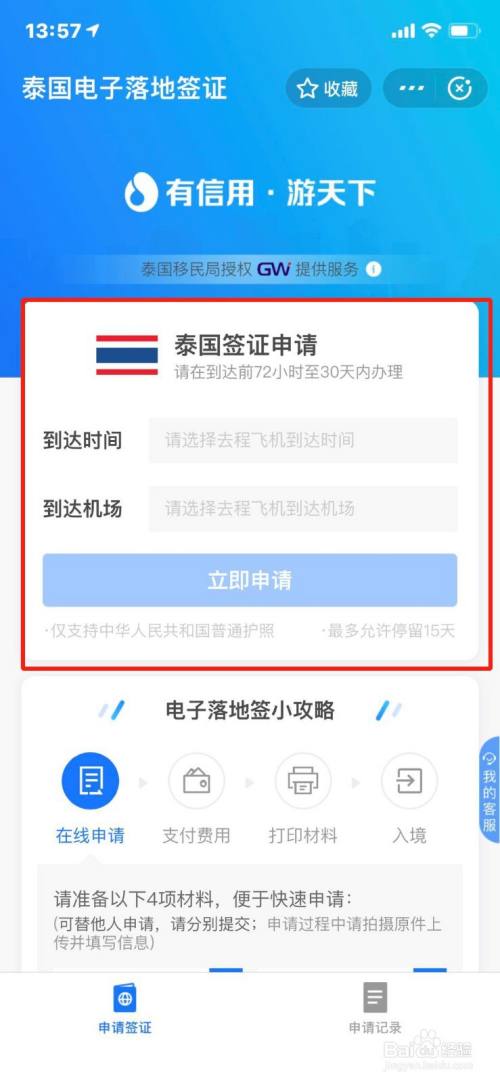填写到达泰国时间及机场,按要求提交机票行程单、护照等资料