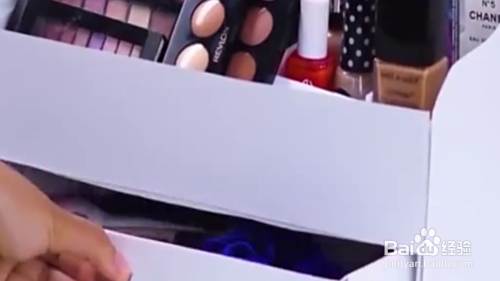 将鞋盒去盖,将边缘裁掉,中间加几个小盒子,就能成为一个简易版化妆品盒了