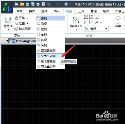有的CAD版本里会“三维建模”这个选项,在这里我们就选择“东南轴测图”就可以了 这样子打开的也是三维空间,大家看一下左下角的这个标志就可以看得出来