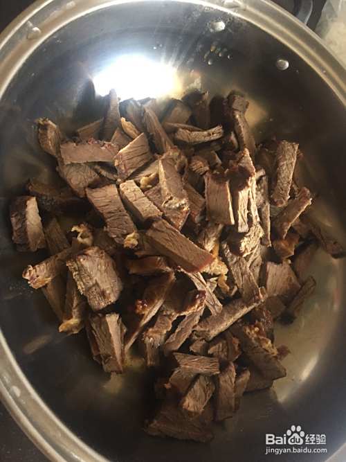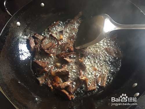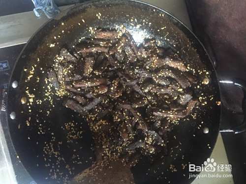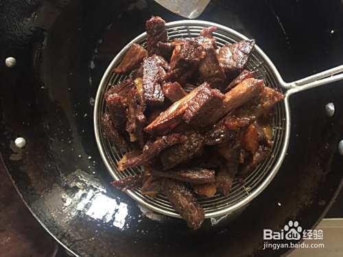 油锅烧热,稍微多点油,油温一定要高,牛肉分两次下锅炸至变色。每次炸完以后,油锅温度要高一些才能再放牛肉。