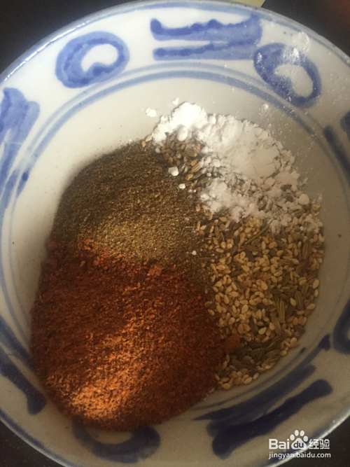 辣椒面,花椒面,孜然粒,孜然粉,花生碎,芝麻,冰糖粉,盐混合备用。
