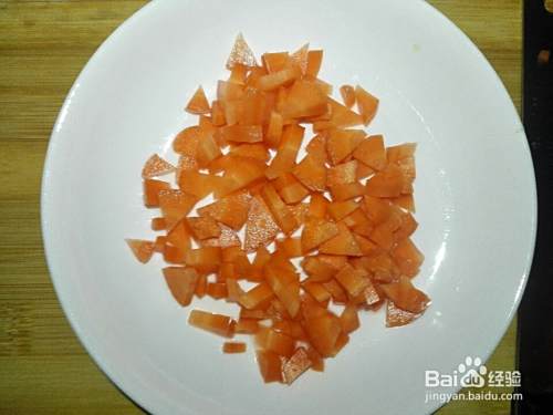 干香菇用热水浸泡半小时,待它充分泡开后,清洗干净,切丁。