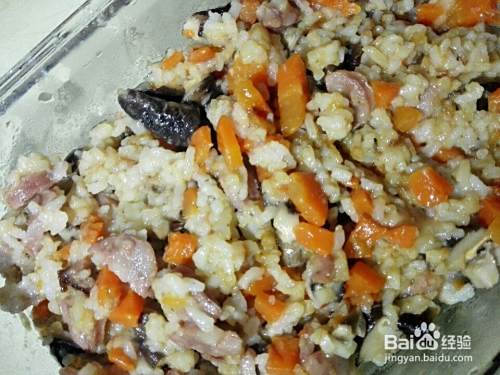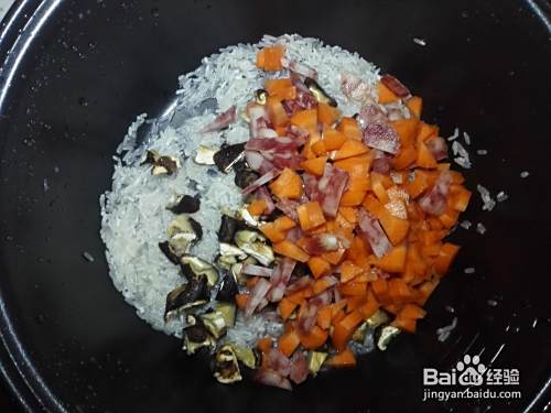 大米淘洗干净,将腊肠、胡萝卜、干香菇一起放进电锅锅中,搅拌均匀。加入适量的水,摁下煮饭键即可。
