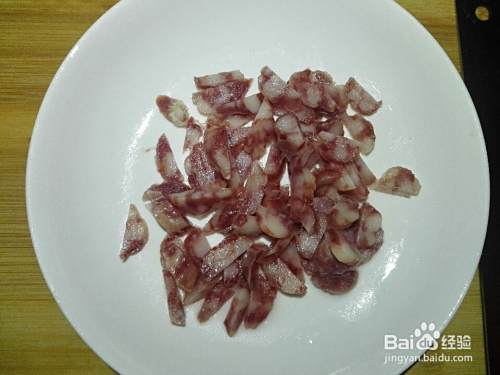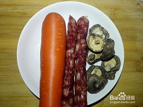 准备腊肠2根、胡萝卜1个、干香菇6朵。一定要用干香菇,会使煲仔饭的味道更香。