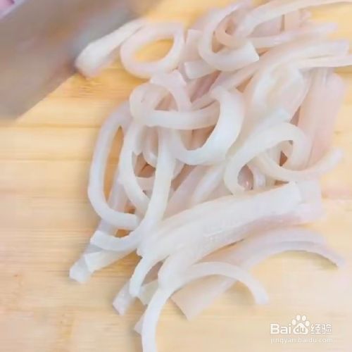 煮好的猪皮再次用刀刮一下,切成细条。加上一勺盐和食用碱,抓洗几次,去掉油脂。