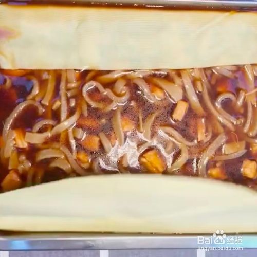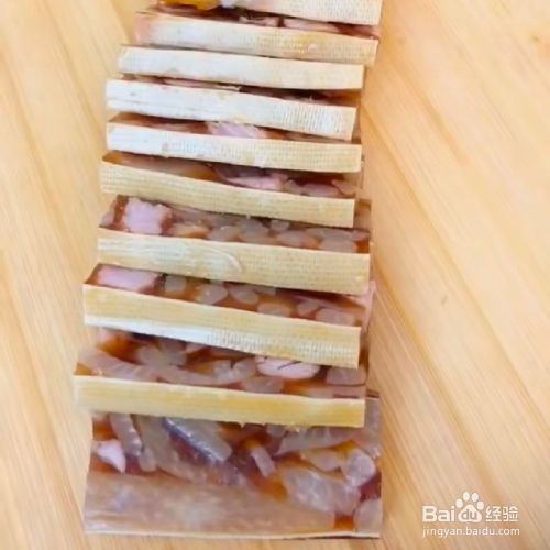 盘里铺上豆皮,把熬至好的汤倒进去再盖上一层豆皮。
