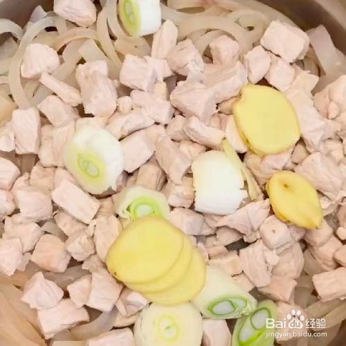 然后把三金肉皮、已经肉块混合均匀,加适量葱姜、八角、桂皮、香叶、八角,盐、laochou加适量清水,煮三十分钟。开锅压三十分钟。
