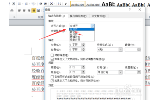 进入页面设置页面之后,主要包括常规设置,缩进设置,间距设置,预览页面,然后第一个常规设置,常规设置主要是对齐方式,一般是左对齐或右对齐。当然,我们也可以根据选择设置对齐方式,如下图所示。