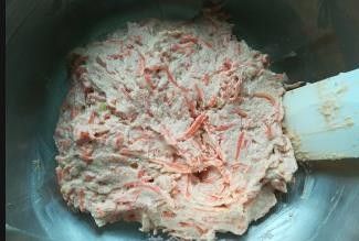 胡萝卜擦丝装盘。豆腐碾成泥,也放入盆中。