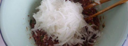 腌渍好的白萝卜丝挤去水分,放入拌好的肉馅中