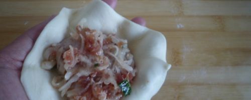 擀成中间略厚四边薄的面皮(剂子大小随意)取一份面皮,放上拌好的馅料