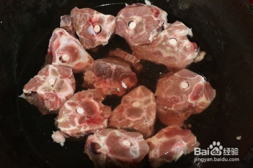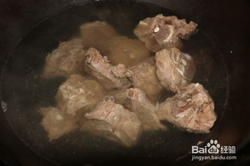 羊蝎子冷水下锅,水开后撇去浮沫,冲洗干净。
