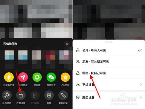 2、点击右下角三点,点击权限设置,勾选【私密仅自己可见】即可隐藏作品。