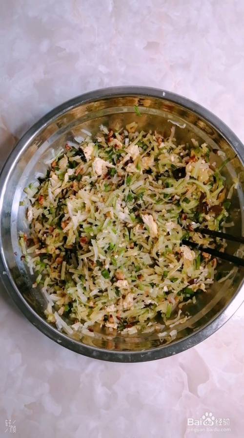 萝卜丝捞出来后,稍晾几分钟,攥干水分,用刀剁碎