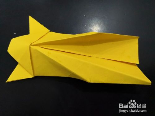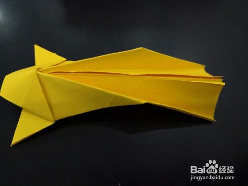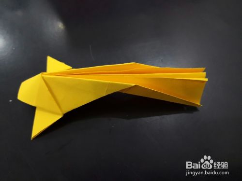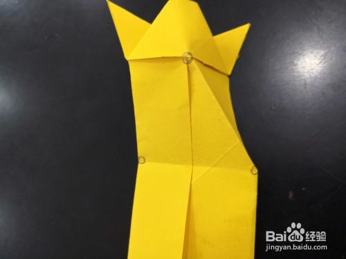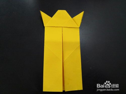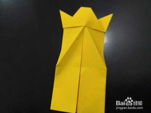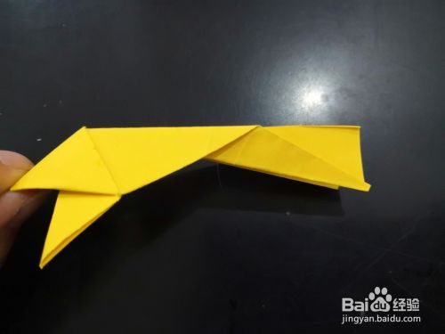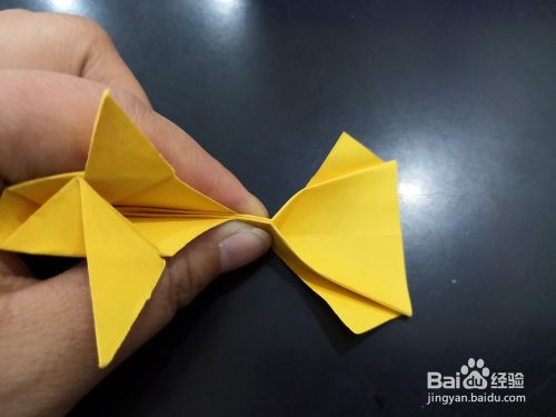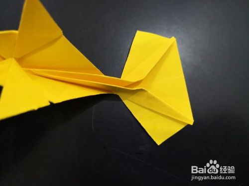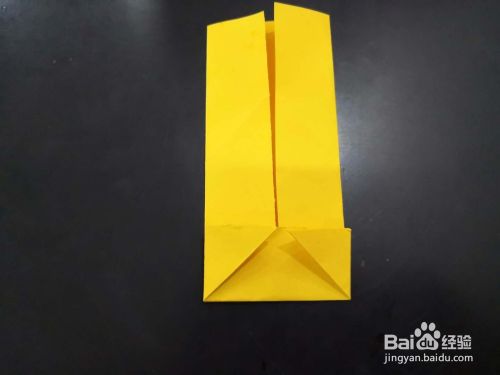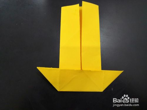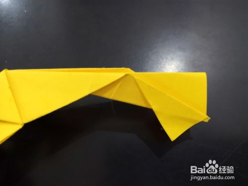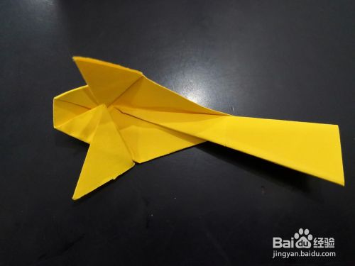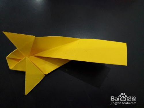 从侧边看,将尾部外层的角分别向下折下来,我们用手指捏住中间纸张中间最窄的部分,将尾端平铺的平面上,然后压实。
