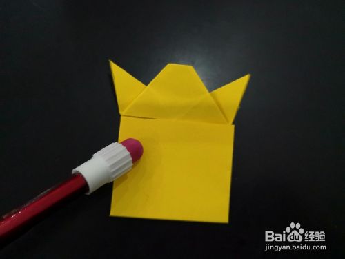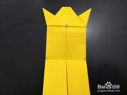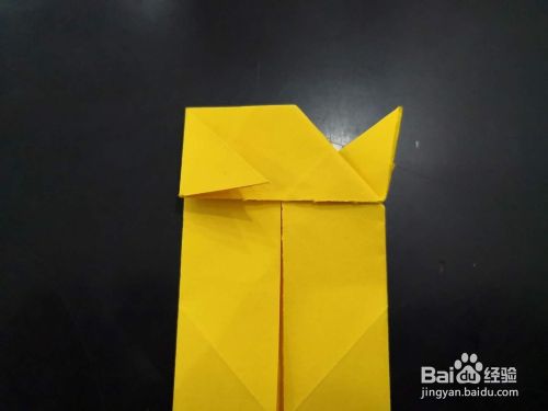 我们换个角度,该端的两个角再分别向背面折叠,折的时候头部两边要留下一段距离,角尖顺势翻过去。