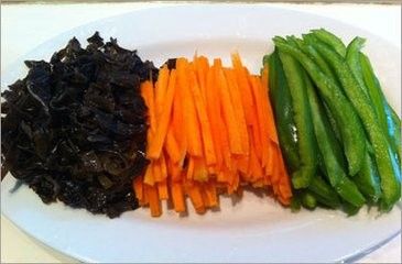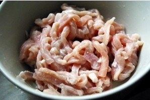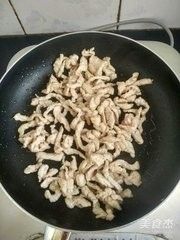 这个时候木耳因该已经煮好了,捞出和胡萝卜青椒放一起备用。点火热油开始滑肉丝,油温不要太高,三四成就行,不然肉会老的。