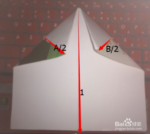 然后找到A和B的中点位置,依此为基准将长方形的两角分别向第一个折好的面的相反方向对折