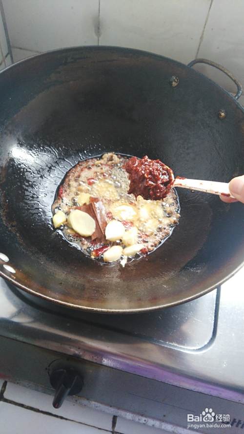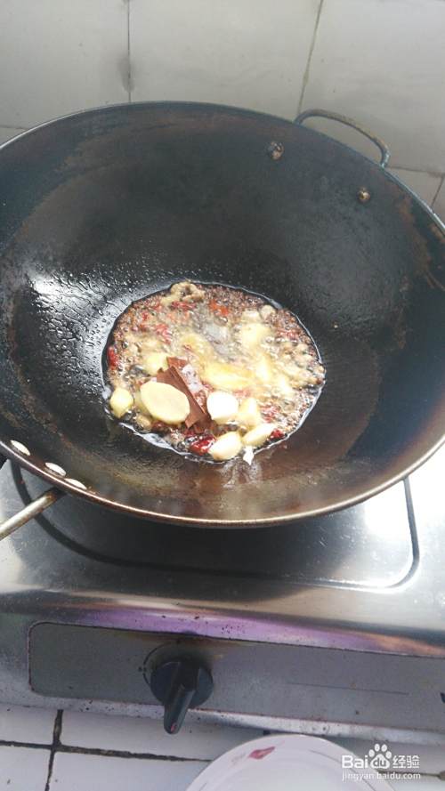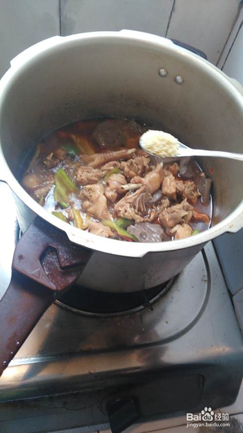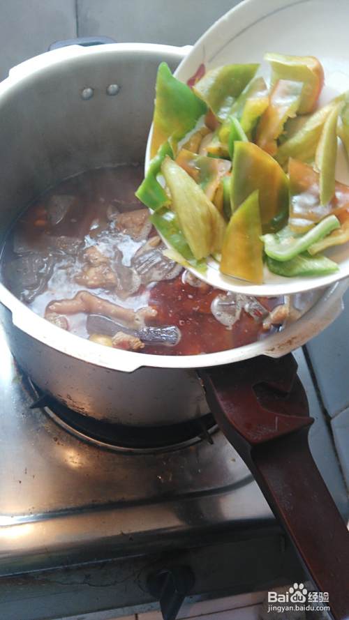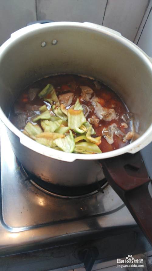 等高压锅冷却后,将锅盖揭开,加入备好的辣椒;