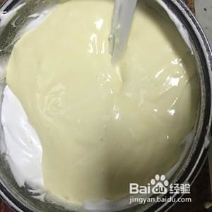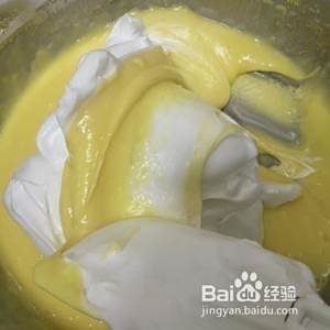 搅拌均匀,再将搅拌好的蛋黄糊倒回蛋清糊里继续搅拌!也是从低往上拌的方法。