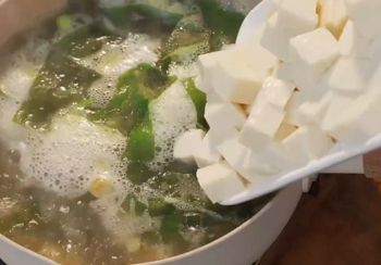 再加入裙带莱,加水煮20分钟,再加入嫩豆腐,淋上鸡蛋液