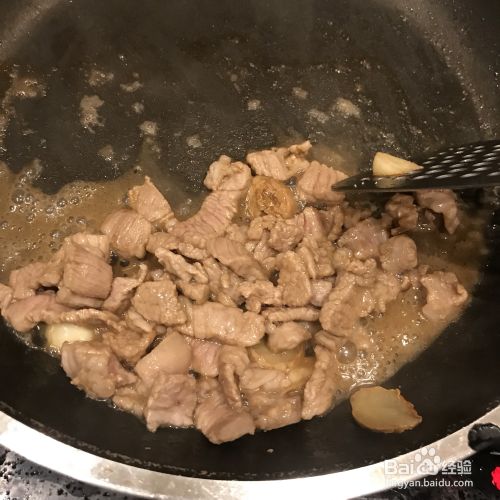 香味出来后,把切好的肉放进去炒。这时,火很旺,放了一勺料酒。(由于火蒸发快,除臭效果好)