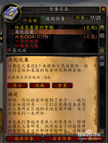 [腐化之巢]任务要求我们我们找到5个森提帕尔昆虫肢体,交给加基森的炼金师匹斯特苏格。