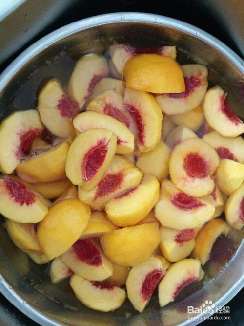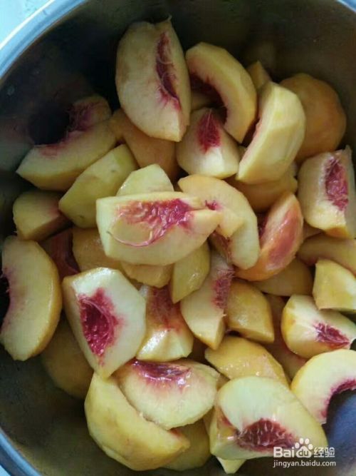 第一步就是把买回来的黄桃去皮,挑选黄桃时一定要选黄的硬的,因为煮黄桃时间较长太软的桃子最后煮的就烂了。一个小技巧去皮,用热水把桃子煮几分钟然后捞出放入冷水中,热胀冷缩的原因桃皮就很容易扒下来了。但如果你要平时吃桃子不要用这个办法扒皮哦,因为热水煮过后味道没有直接吃那么好。