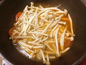 菇熟以后,加入豆腐,然后加盐,生抽,白糖调味