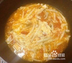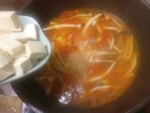 倒入切好的西红柿,接着倒入适量清水,等水沸腾以后,接着把两种菇加进去