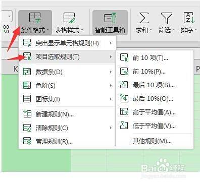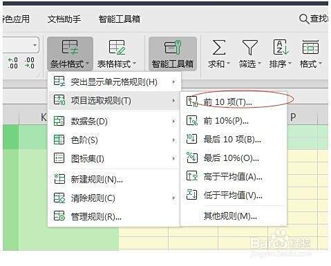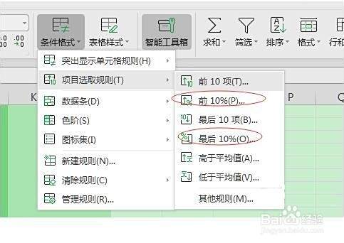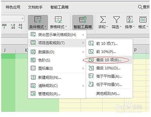 4、标记最后一名,或者最后多少名。选择【最后10项】。与前面操作方法一样。还有标记前10%,后10%,这个数字可以改。跟前面方法相同宋此,不再赘述。
