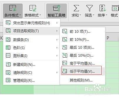 1、筛选出低于平均值的。就选择【低于平均值】,然后设置一种展示格式。