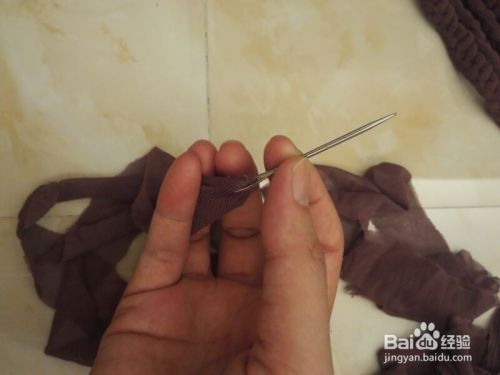 接下来将一条没有勾成辫子的布条穿入大头针的孔中做为“线”