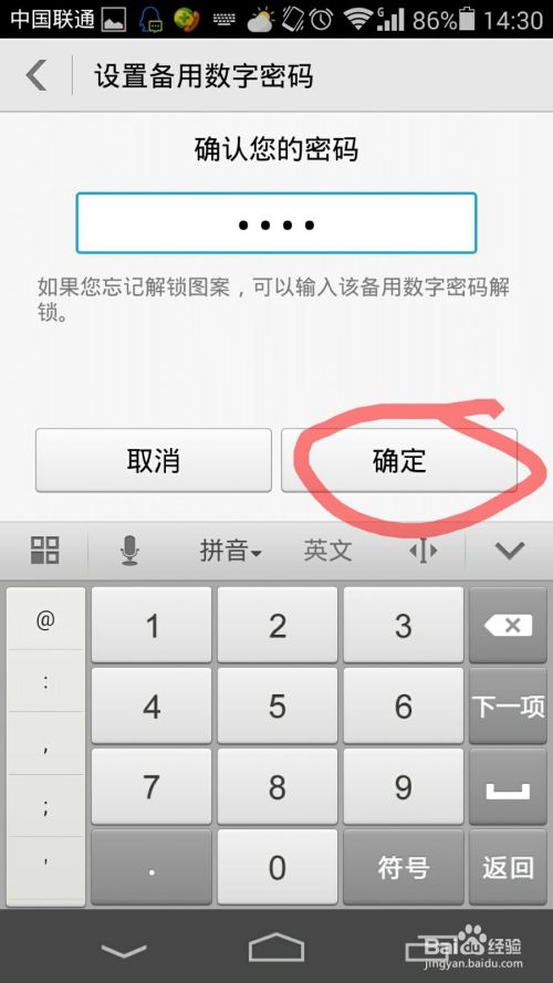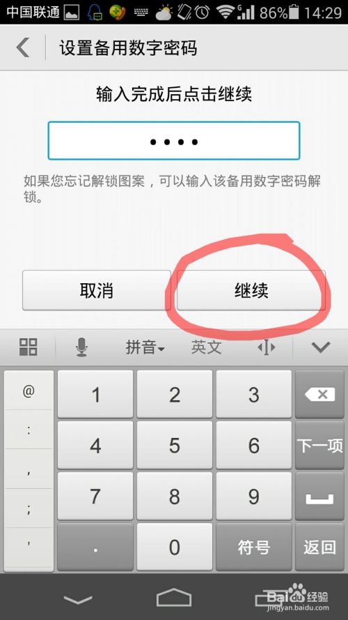 再次确认绘制的图案,输入您的备用数字密码,继续