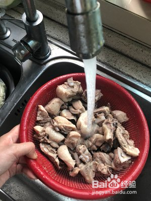 用冷水把鸭肉清洗一遍。上面还有沾着少许血沫。然后晾干水备用。