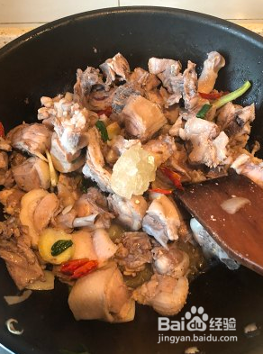 葱姜辣椒洋葱等配料下锅爆香后。加入鸭肉,翻炒一下,放糖,我放的是冰糖。一般的白砂糖都可以的,