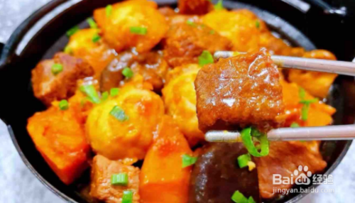 南瓜煮熟后加入先前已经处理过的芋头,改中火慢煮五分钟,出锅前撒点葱花等。这样一道美味的南瓜芋头炖牛肉就做好了。