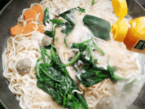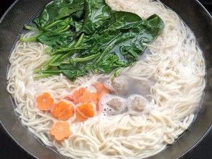 下入牛肉丸子、菠菜、胡萝卜,如果你的水放的比较少,要不停的拿勺子搅一下面条,小心糊底。