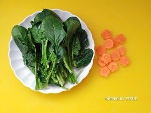 将菠菜清洗干净,如果比较大颗可以切一下,胡萝卜切片儿,我为了哄孩子多吃点儿菜,所以拿模具刻了一下花型,你们随意。