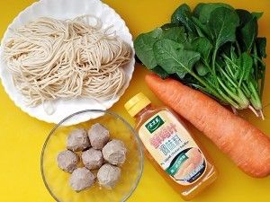 首先准备一下材料,面条、牛肉丸子、红萝卜、菠菜、太太乐鲜鸡汁。