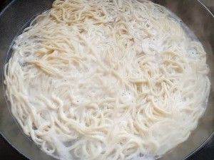 锅中添水,大火烧开后,下入面条,然后调成中火。