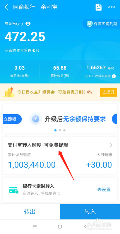 打开后,即可看到本人支付宝余利宝免费提现到银行卡的剩余额度,可以通过点击攒收益涨额度来提高免费提现到银行卡的额度,然后点击打开额度明细