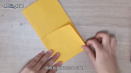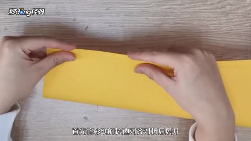 2将彩纸的长边对齐对折后展开。