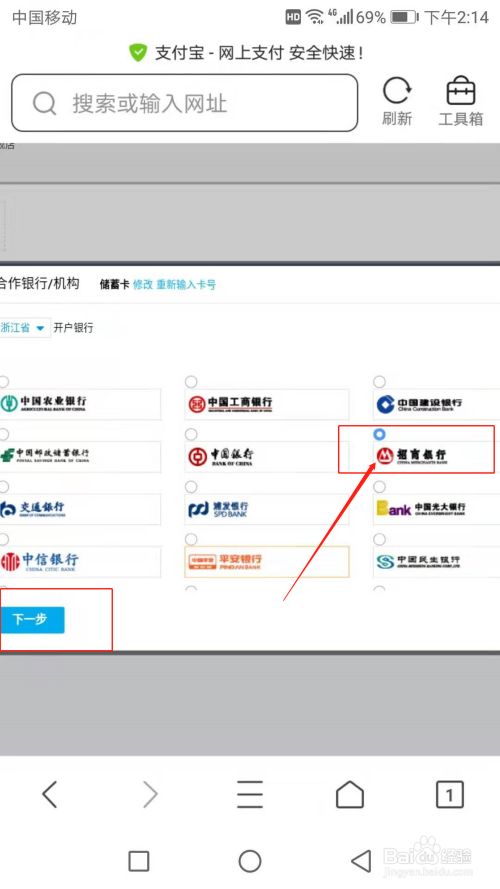 然后选择拟选用的银行(目前已知的可以扫码支付的银行有兴业银行,招商银行,建设银行,其他的暂时不清楚),现在以招商银行来演示。选择“招商银行”选项,进行下一步。